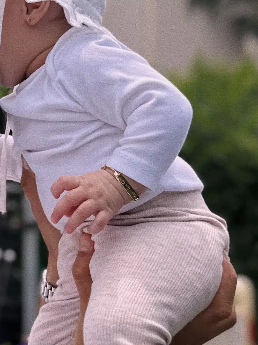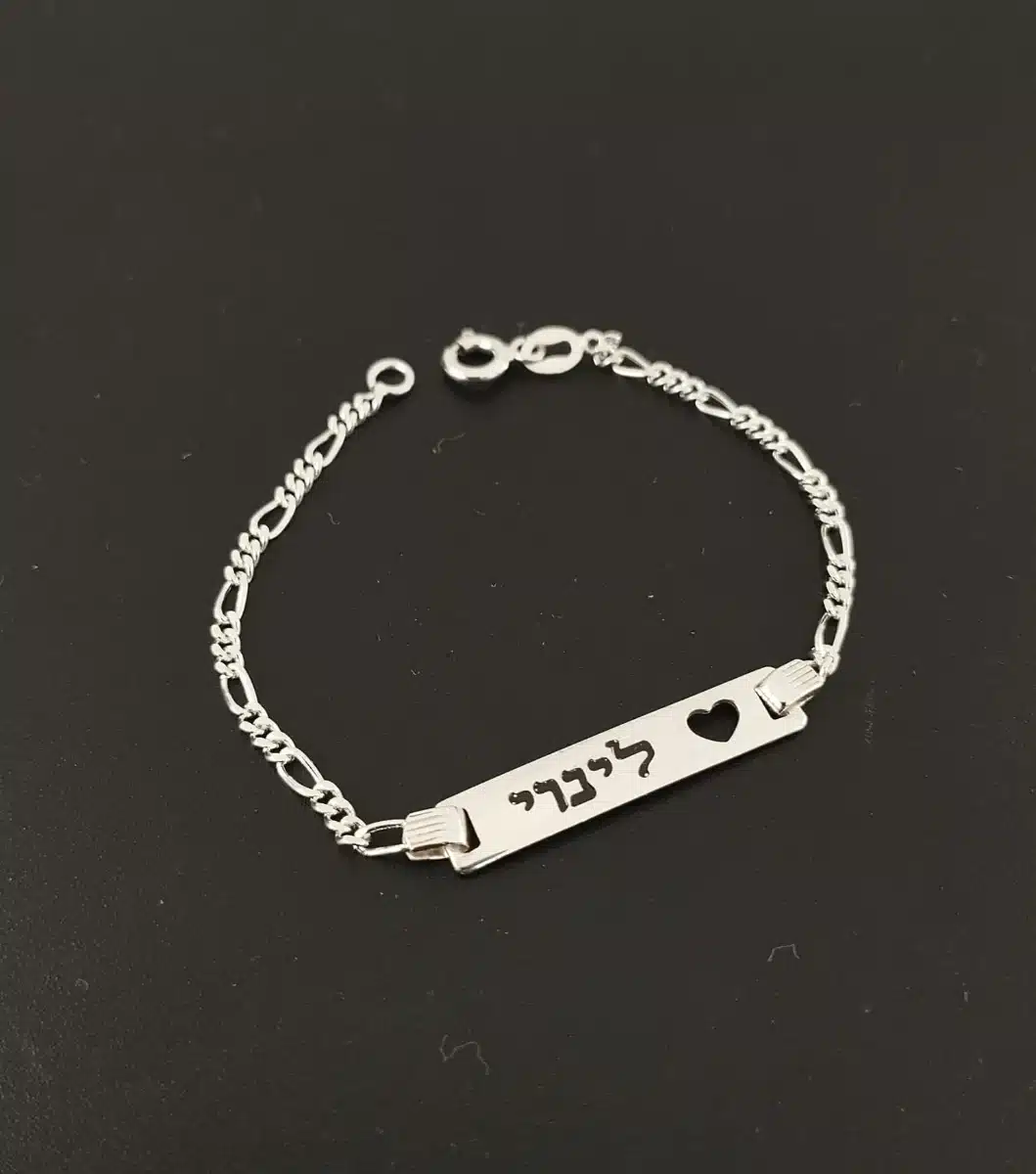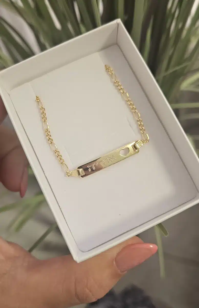 צמיד חריטה אישי לילדות ותינוקות – כסף / זהב ( ללא עמידות לתווך ארוך) צמיד עדין ומתוק בעיצוב אישי, עם חריטת שם בעברית או באנגלית לבחירתך. מתאים לתינוקות וילדות, עשוי בציפוי כסף או זהב לפי בחירה. ✓ אורך הצמיד: 13 ס"מ – ניתן לקצר בהתאמה ✓ שם לחריטה: יש לציין בהערות ההזמנה לתשומת לבך: בזמן זחילה של תינוק ייתכן שחיקה של הציפוי על גבי הפלטה עם השם. ציפוי זהב לא עמיד לתווך ארוך מומלץ לשמור