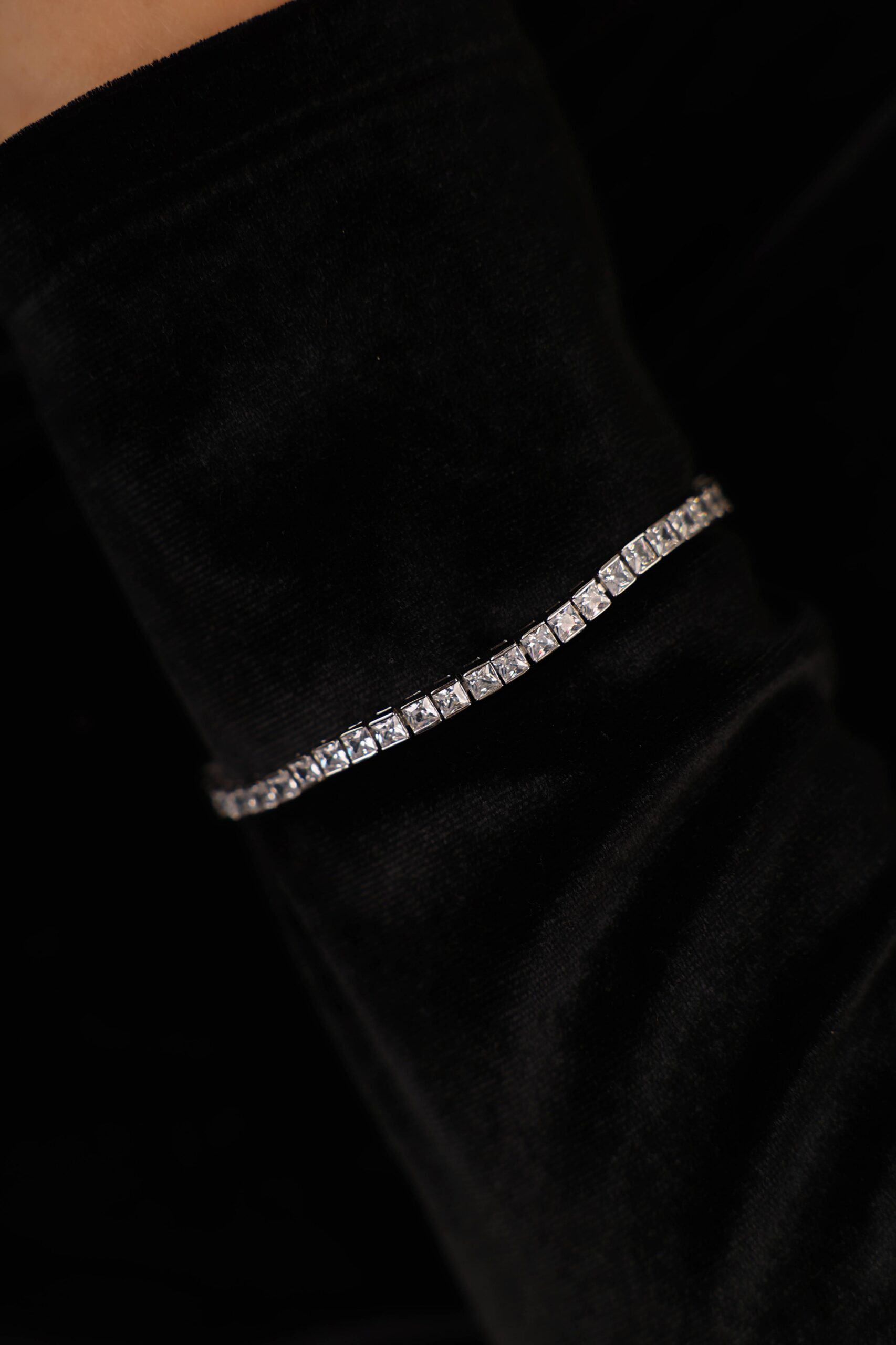צמיד טניס קלאסי מרובע עשוי מכסף טהור 925, עם שיבוץ אבני זרקוניה מרובעות . הוא מגיע בשלושה גדלים לבחירה: דק, בינוני ועבה, להתאמה אישית למידות שונות. הצמיד מתאים לשימוש יומיומי ולשילוב עם תכשיטים נוספים,