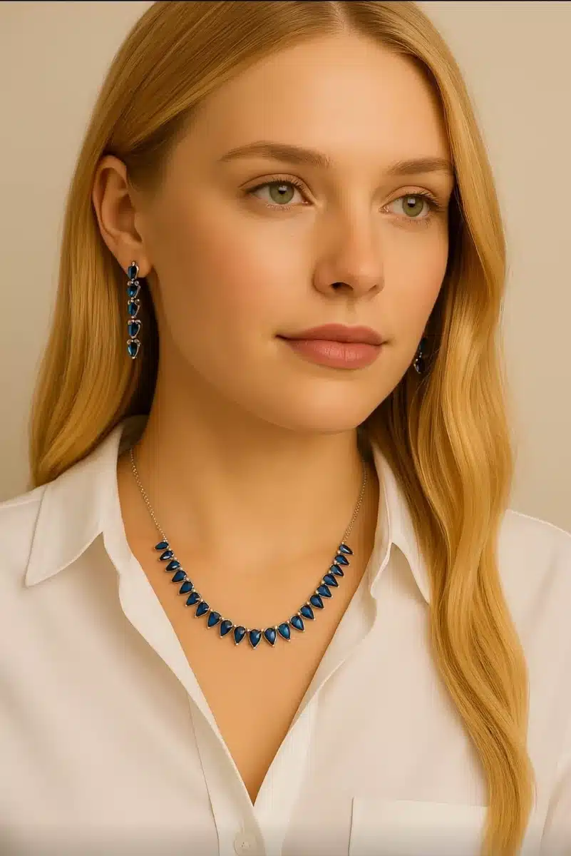 סט טיפות כסף טהור קלאסי, נקי ונוגע – סט במראה טיפה שמוסיף נוכחות בשקט. עשוי מכסף 925, לאוהבות סטייל על זמני. בשיבוץ זרקונים כחולים