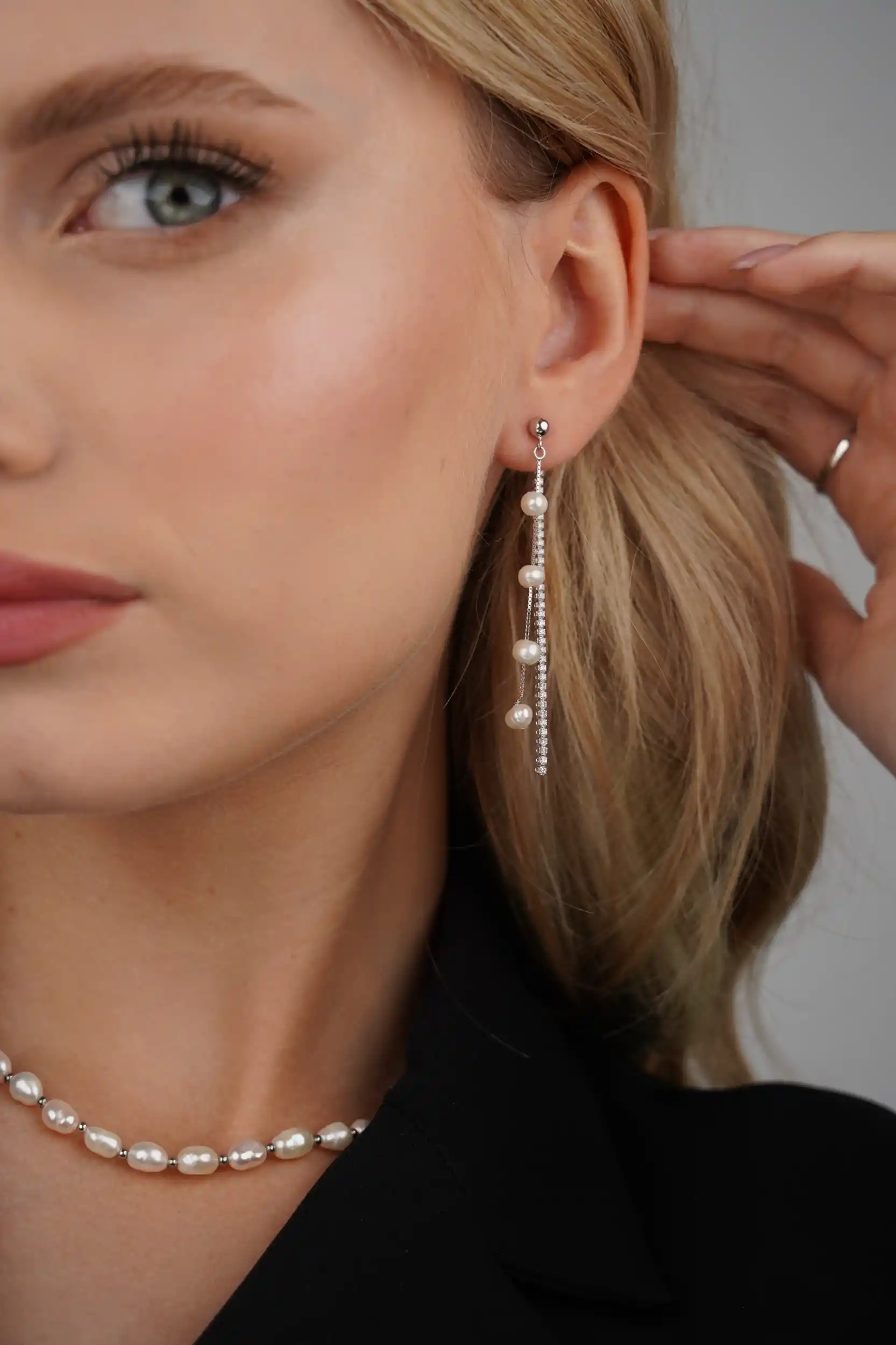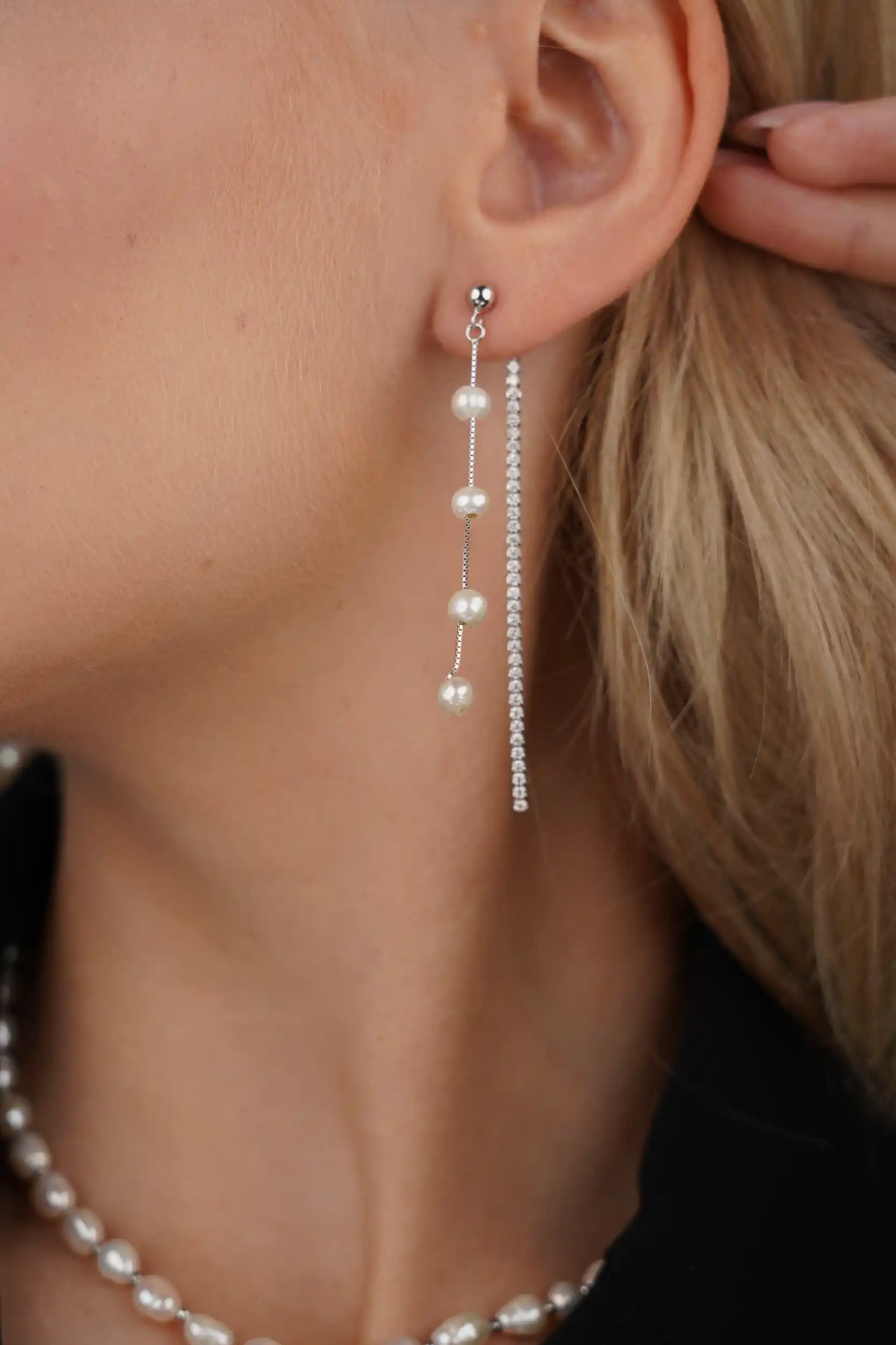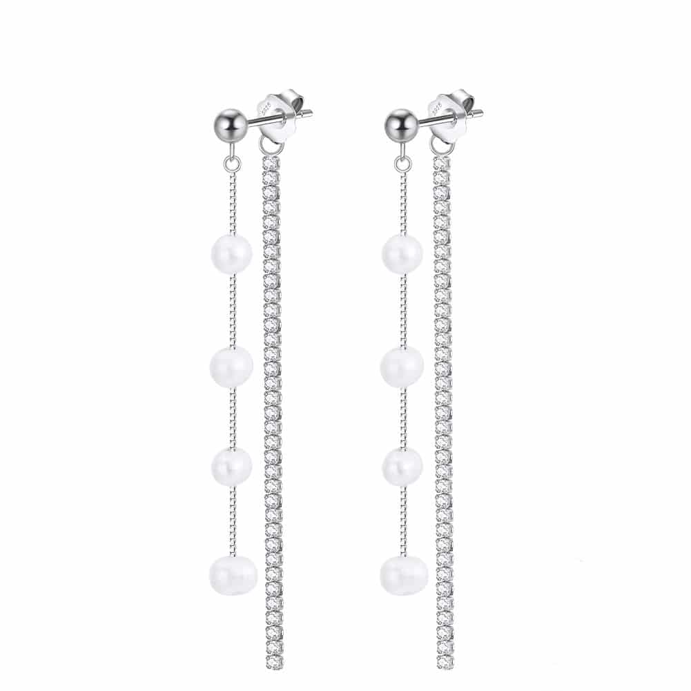 עגילים תלויים בעיצוב אלגנטי ומודרני, שמשלבים שורת זרקונים עדינה בסגנון טניס עם פנינת מים מתוקים בקצה. עשויים כסף סטרלינג 925 בציפוי זהב 14 קראט – שילוב מושלם של ברק ונשיות רכה.