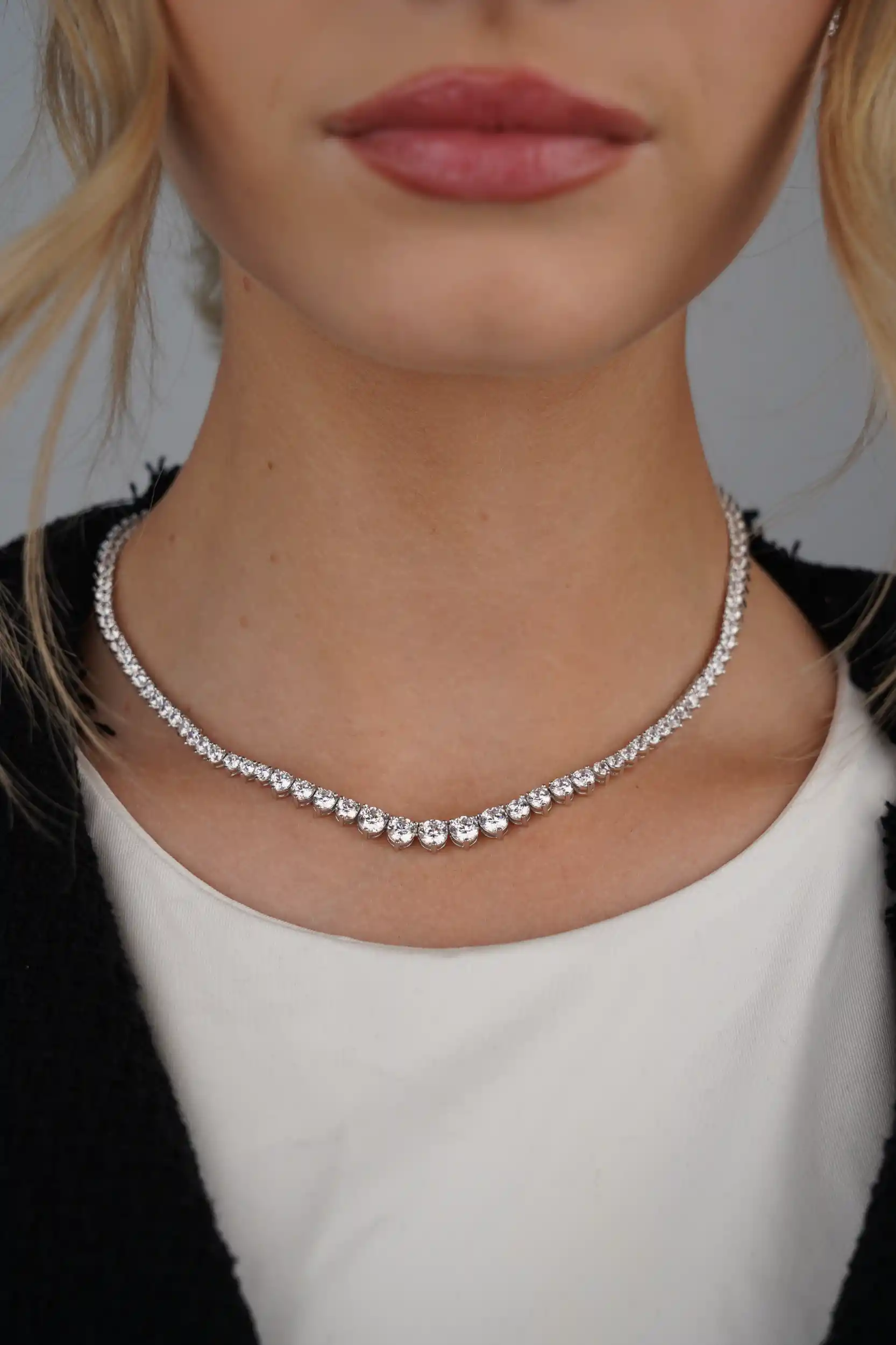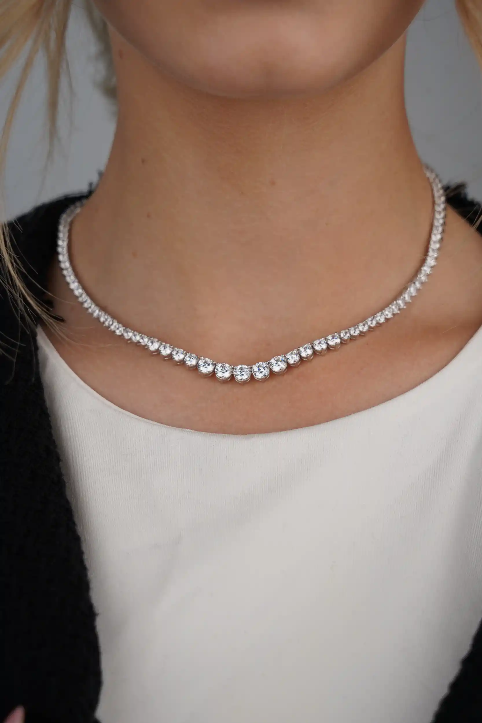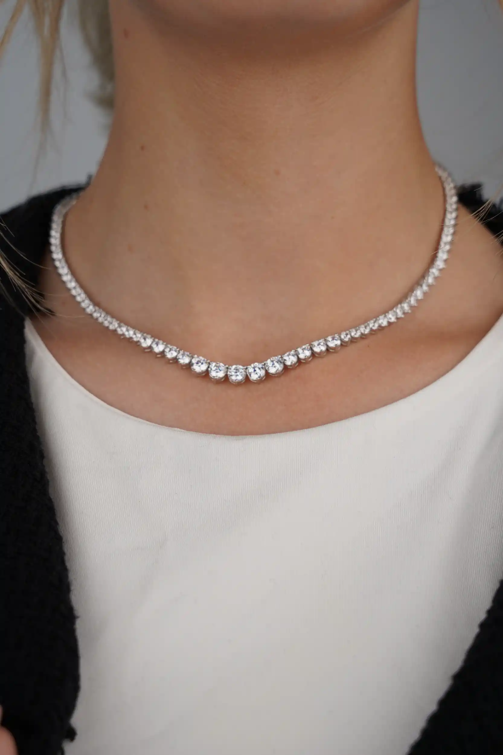 שרשרת טניס מכסף טהור 925 בעיצוב קלאסי ועל-זמני, עם אבנים מדורגות שמשוות לה מראה יוקרתי ועדין. אורך השרשרת 40 ס"מ – מושלמת לענידה יומיומית או לאירועים מיוחדים. זמינה בגוון כסף או כסף בציפוי זהב לבחירתך.